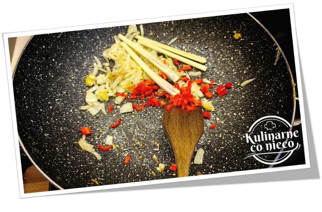 Następnie dorzucić trawę cytrynową wraz z papryczką i podgrzewać razem przez chwilę, aż trawa zacznie intensywnie cytrusowo pachnieć.