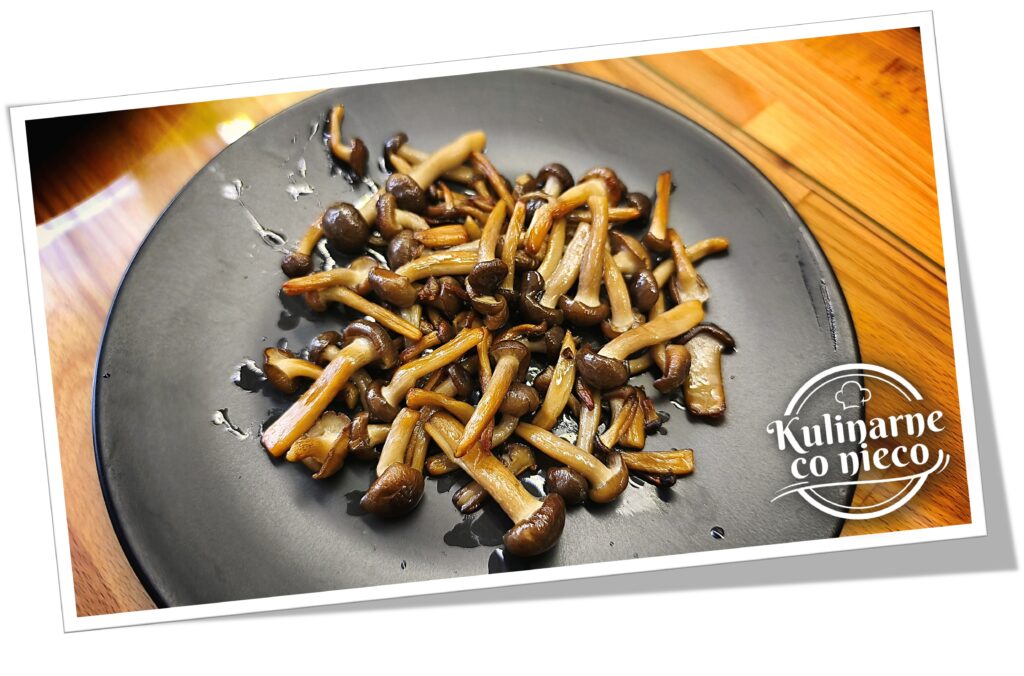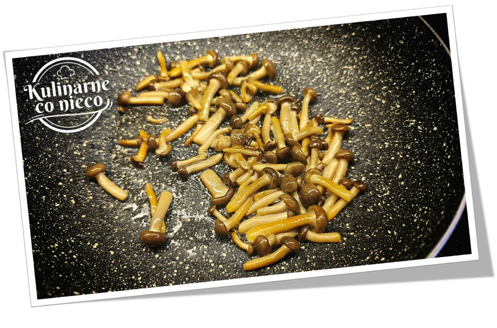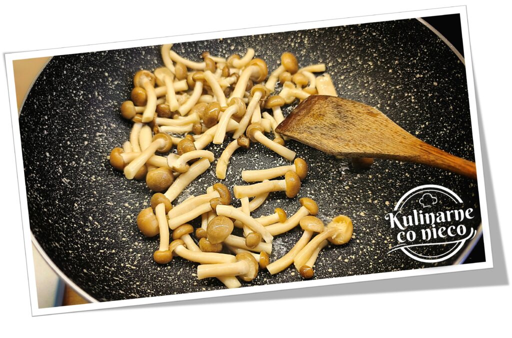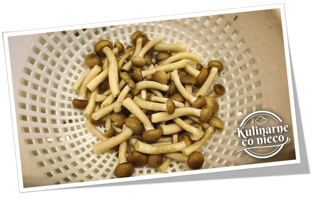 Grzyby shimeji rozdzielić ręcznie na mniejsze kępki, usuwając tylko twardą podstawę, ale nie kroić ich drobno, aby zachowały swoją strukturę i ładnie prezentowały się w zupie.