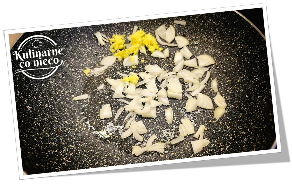 Dodać cebule oraz starty imbir i smażyć na małym ogniu ciągle mieszając, aż cebula stanie się miękka, lekko szklista i zacznie delikatnie słodko pachnieć. Nie dopuścić do zrumienienia, bo wtedy smak zrobi się cięższy i mniej świeży. Dodać czosnek i smażyć przez 30 sekund tylko do momentu aż czosnek zacznie pachnieć.