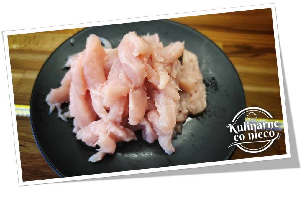 Polędwiczki z kurczaka oczyścić z ewentualnych błon i ścięgien a następnie pokroić w cienkie plastry lub niewielkie kawałki, dzięki czemu mięso będzie delikatne i szybko się ugotuje.