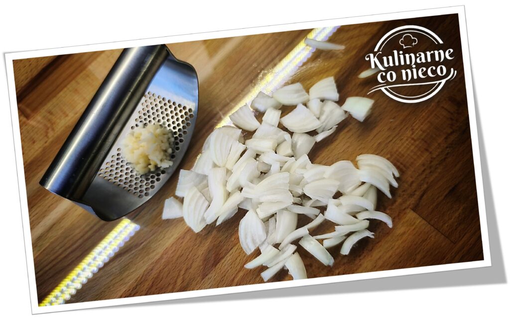 Czosnek przecisnąć przez praskę lub także drobno posiekać.