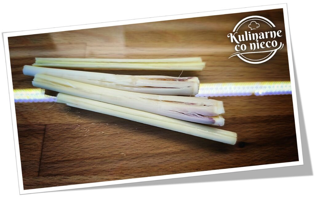 Trawę cytrynową obrać, odcinając twardą końcówkę i usuwając zewnętrzne, zdrewniałe warstwy. Miękką część łodygi lekko rozgnieść nożem lub trzonkiem, aby uwolniła aromat a następnie pokroić na większe kawałki.