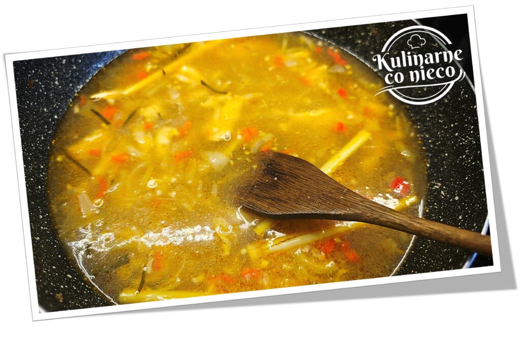 Następnie wlać całość do garnka i delikatnie wymieszać. Ten moment nadaje zupie głębi i charakterystycznego, lekko pikantnego aromatu.