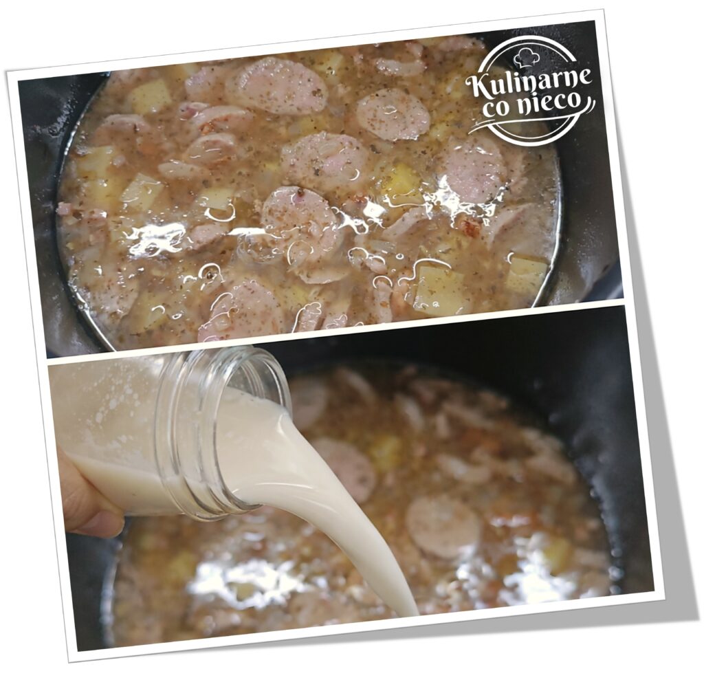 Dodać cebulę i smażyć do zeszklenia. Następnie dodać czosnek i podsmażyć bardzo krótko, tylko do momentu aż zacznie intensywnie pachnieć. Włożyć pokrojoną kiełbasę i chwilę jeszcze podsmażać.