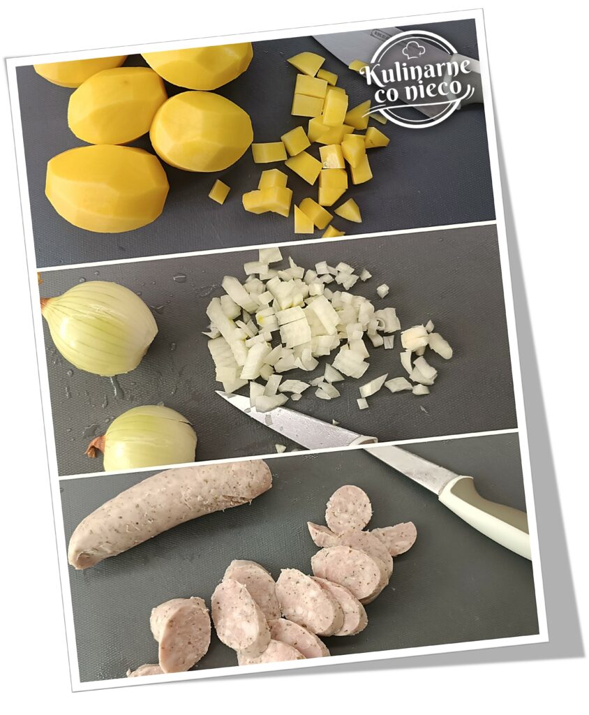 Jeśli zdecydujesz się dodać ziemniaki należy obrać je i pokroić w równą, niewielką kostkę. Zalać zimna wodą i odstawić na chwile na bok.